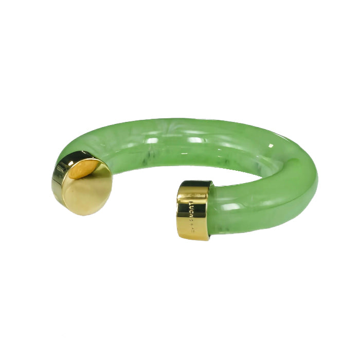 Bold meets playful in Lucas Jack's apple-green resin cuff bracelet. With their sculptural shape and glossy finish, they channel a fresh, modern vibe that pops with personality. Each cuff is accented with 18k gold-plated end caps for a refined touch that elevates the fun.