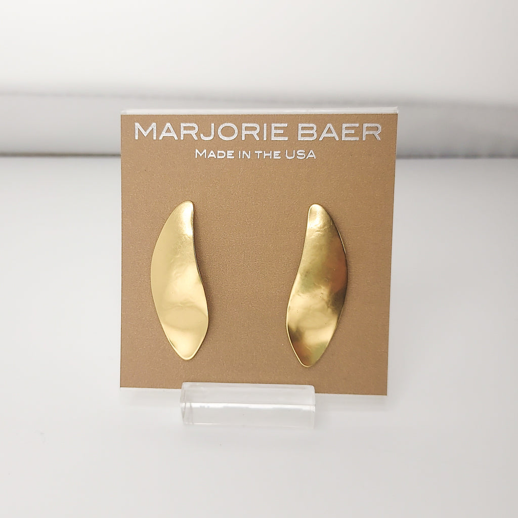 Marjorie Baer's earrings feature a long organic hammered brass piece, creating a unique and elegant shape.