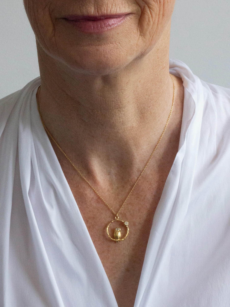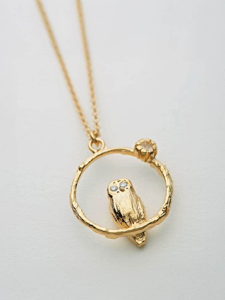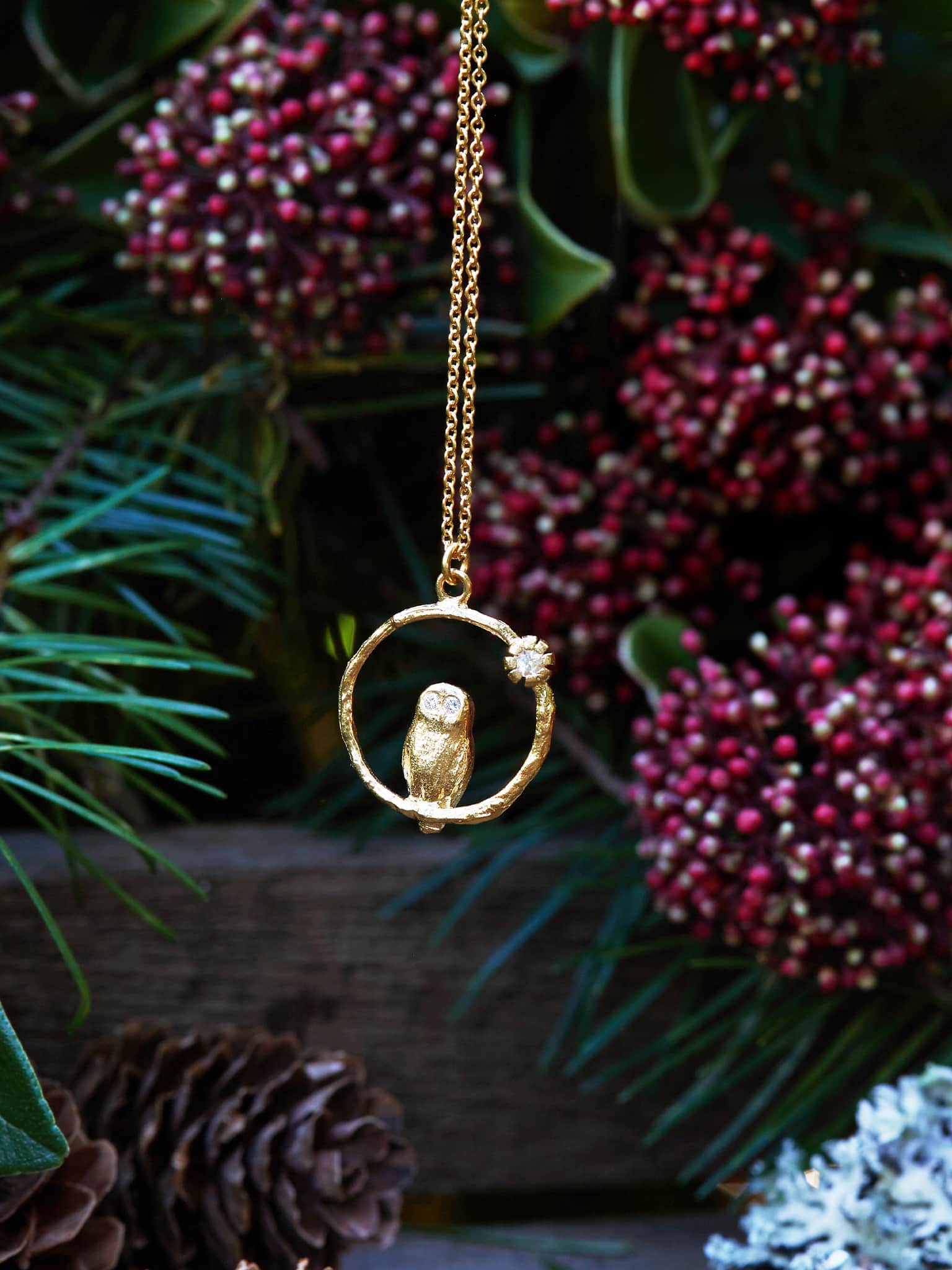 A tiny Owl with piercing moonstone eyes gazes through the trees in this charming loop necklace. Alex Monroe Jewelry is inspired by nature and handcrafted in their London Workshop.