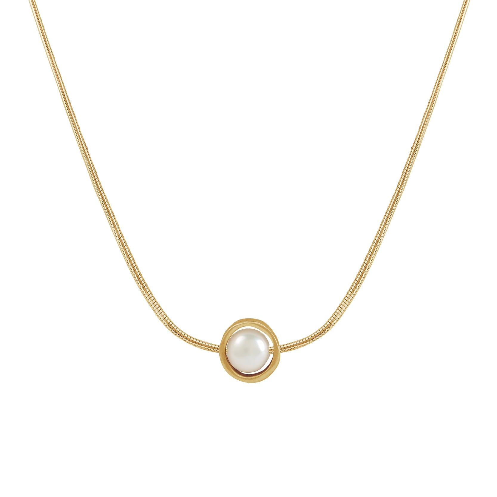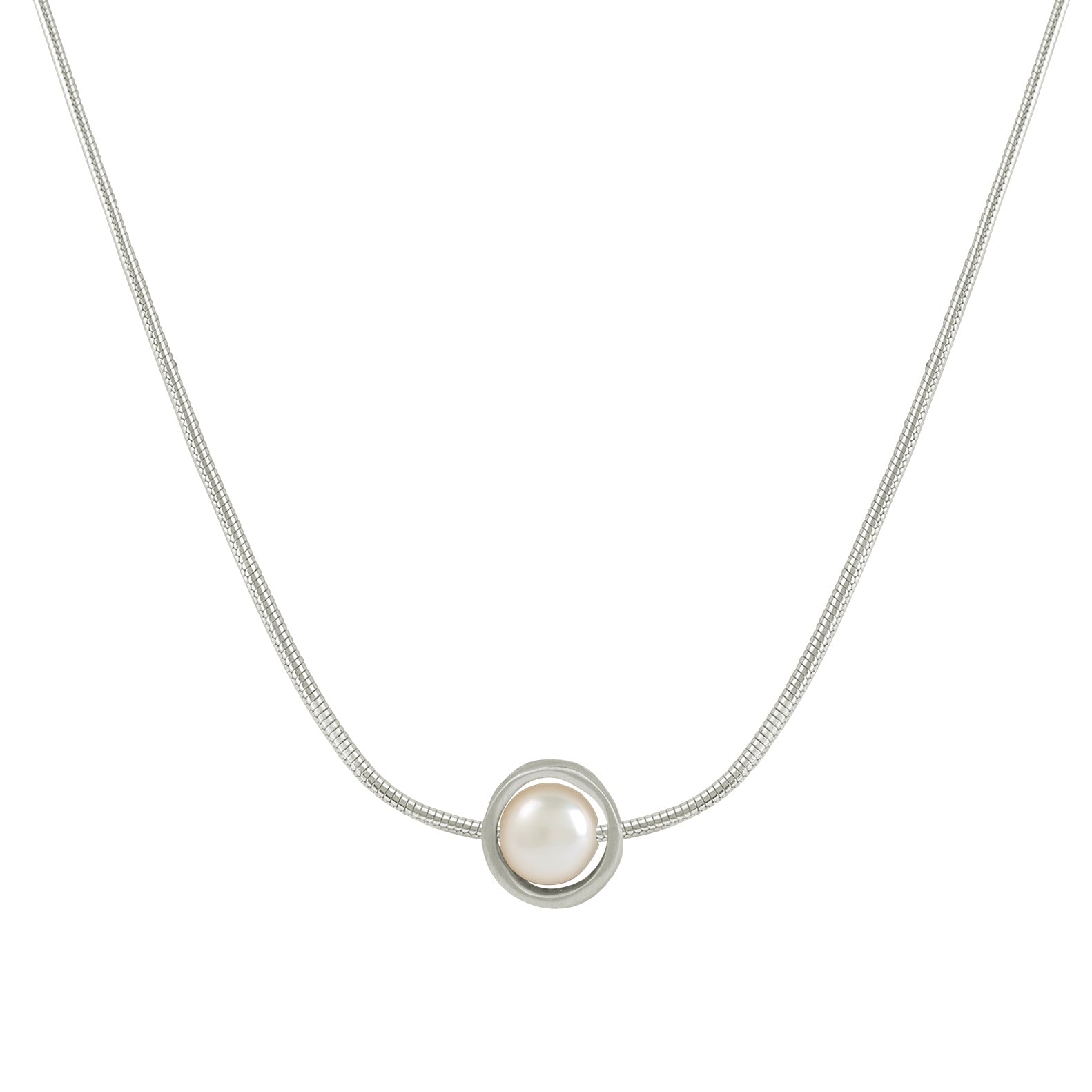Pearl in circle necklace in sterling silver or vermeil by Philippa Roberts. Pendant hangs 1/2” on an 18" snake chain. Item# 1859vn/sn. Our vermeil is sterling silver dipped in 16k gold. Findings are sterling silver and 14k gold fill. Handmade in Oakland, CA.