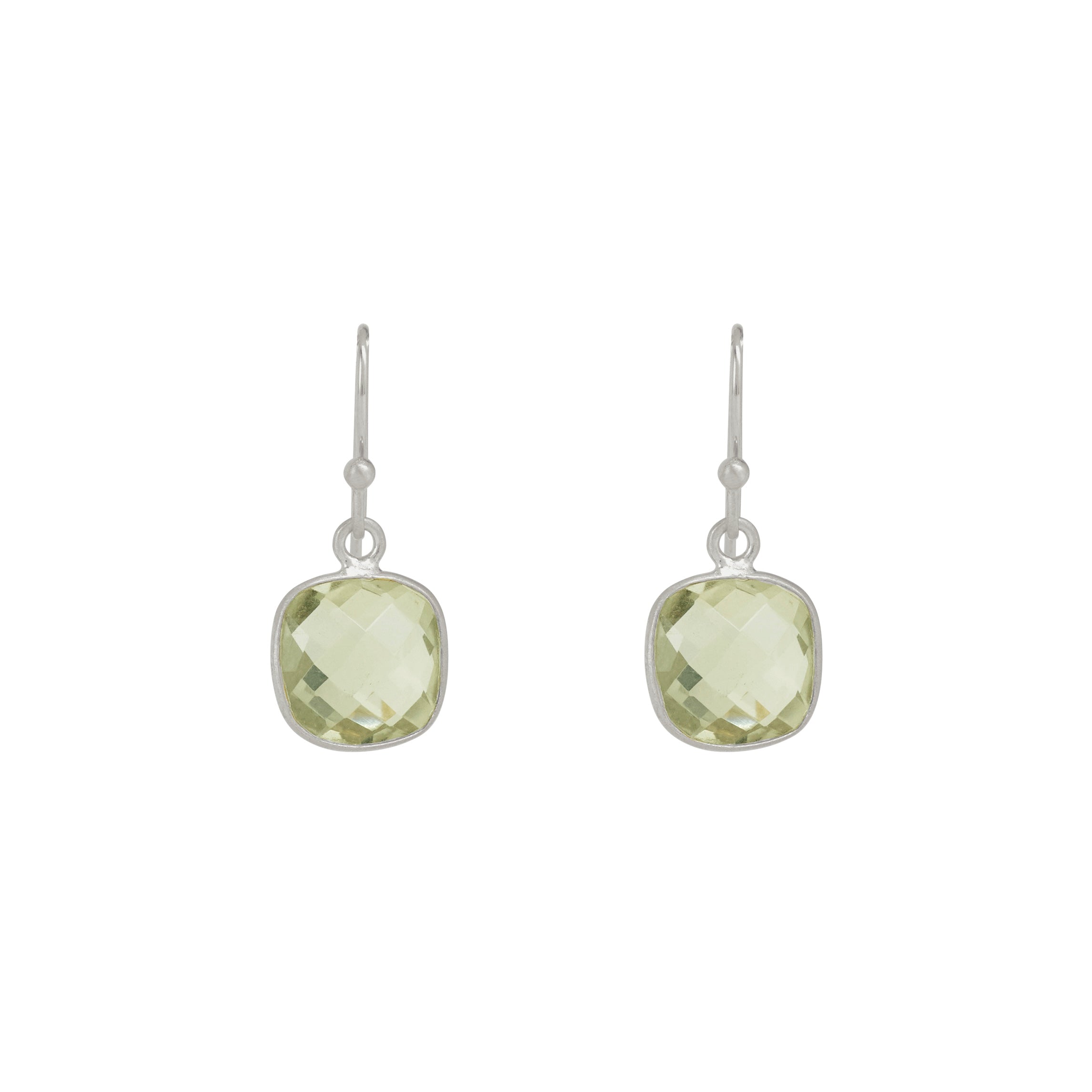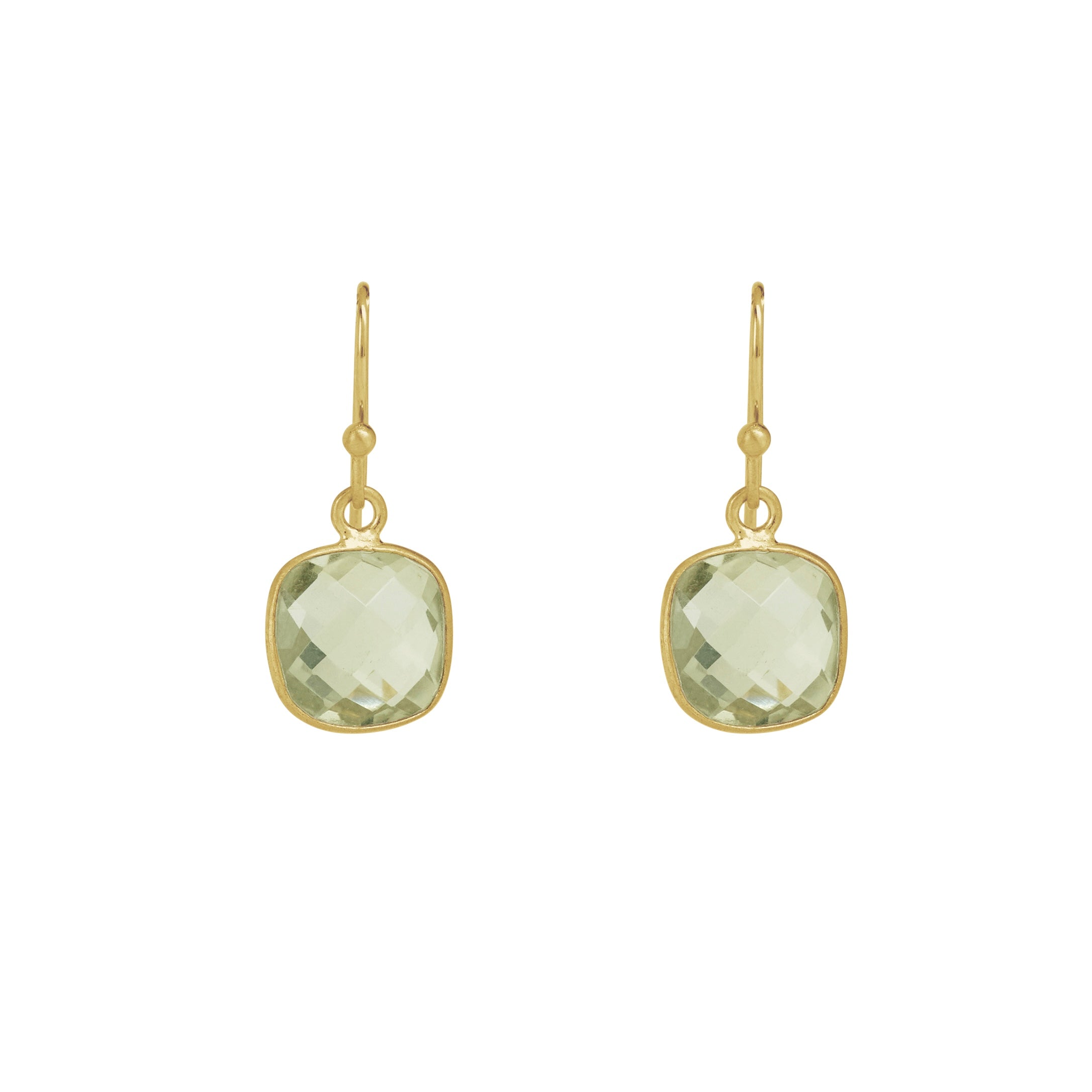 Square faceted green amethyst in silver or vermeil by Philippa Roberts. Earrings Hang approx 7/8". Item# 6206se/ve. Our vermeil is sterling silver dipped in 16k gold. Findings are sterling silver and 14k gold fill. Handmade in Oakland, CA.