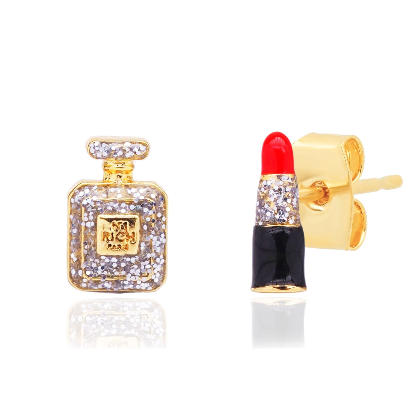 A playful pairing for beauty lovers—this mismatched stud set features a pavé perfume bottle and glossy enamel lipstick design. Equal parts glam and charm, these conversation-starting earrings are ready to add a little fun to your everyday look.
