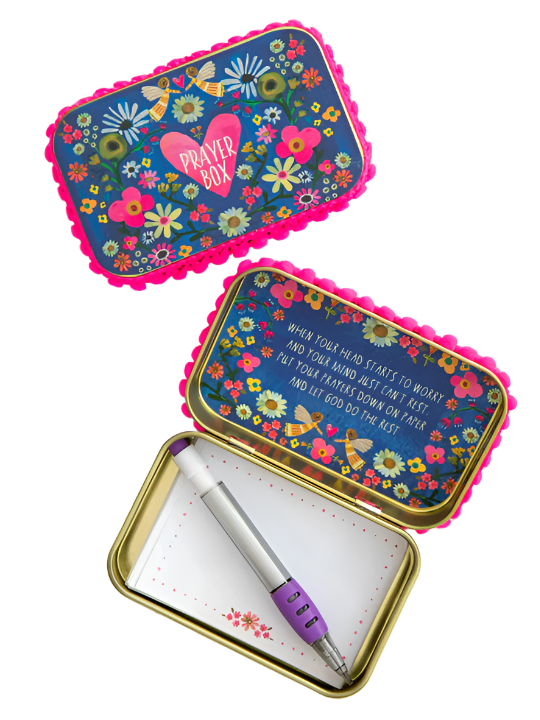 Prayer is Powerful! Open the lid of this denim-colored Prayer Box for an inspirational message and write down your prayers with the included paper and tiny pencil. This makes the sweetest gift for graduation, communion and holidays!
