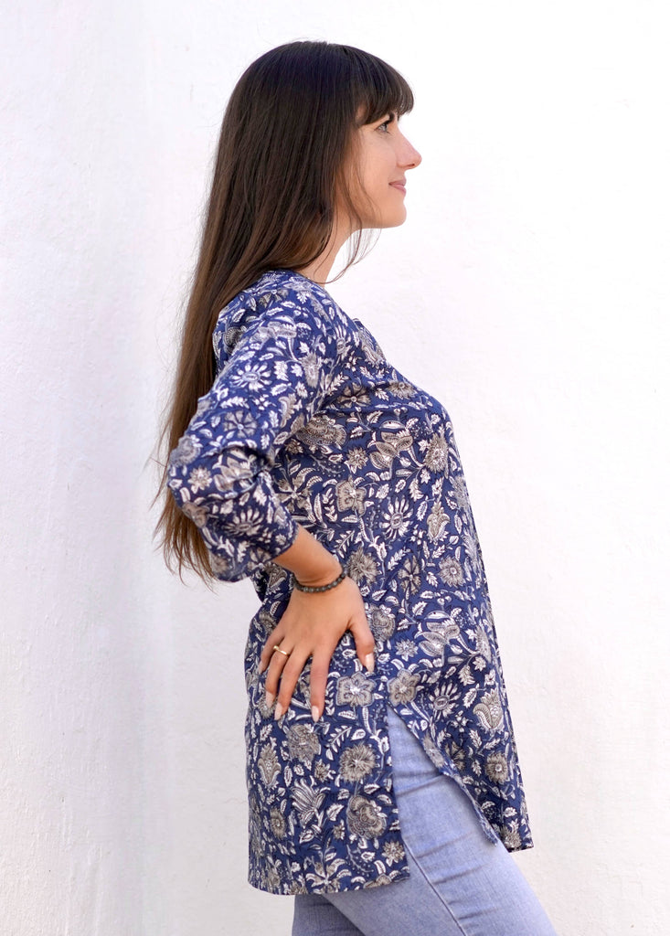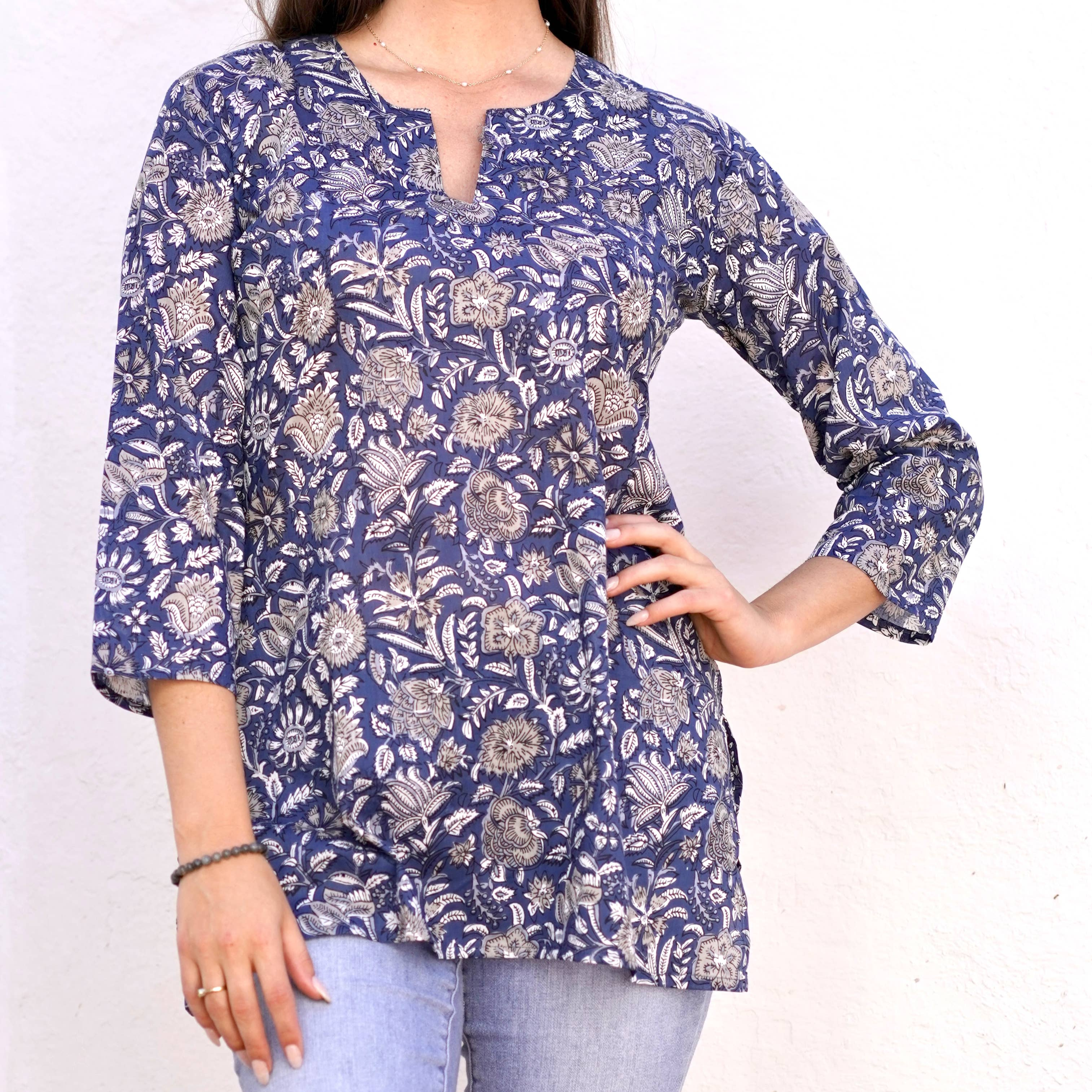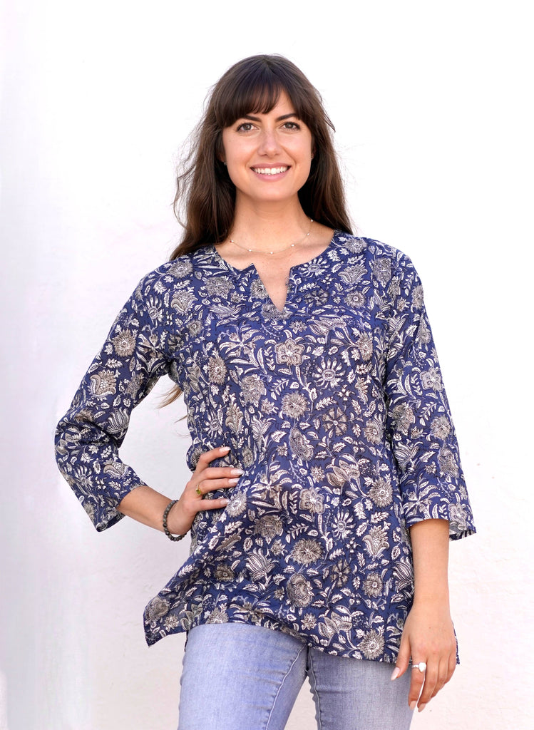 A customer favorite, this soft and lightweight cotton tunic can be easily styled with your favorite denims. This cotton tunic is designed with a relaxed fit with a fun print. The tunic features 3/4 sleeves, a split v-neck, and side slits at the hemline for easy movement. • 100% Cotton • 3/4 Length Sleeves • Side Slits • Care: Hand Wash Cold/ Gentle Cold Wash in Machine and Hang to Dry