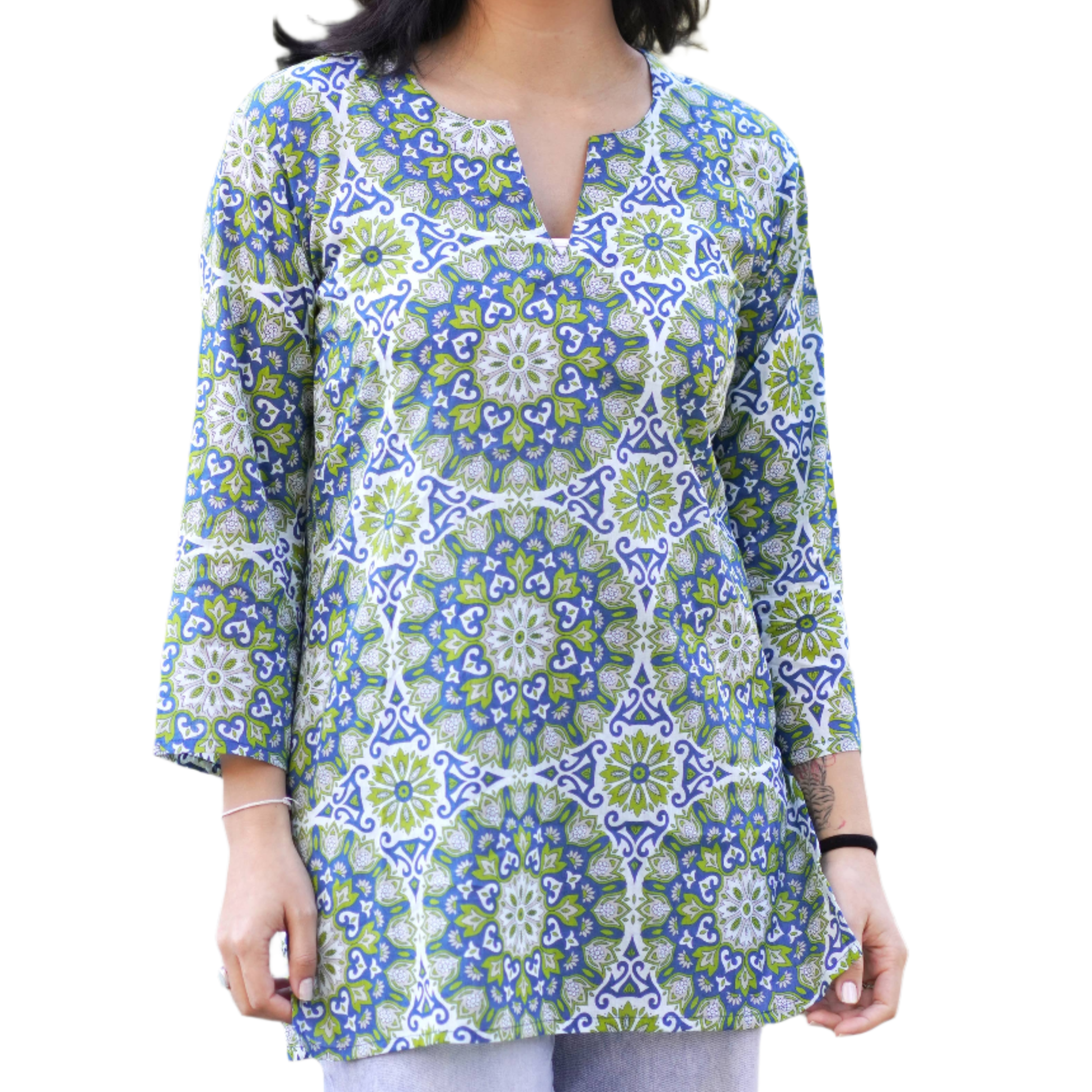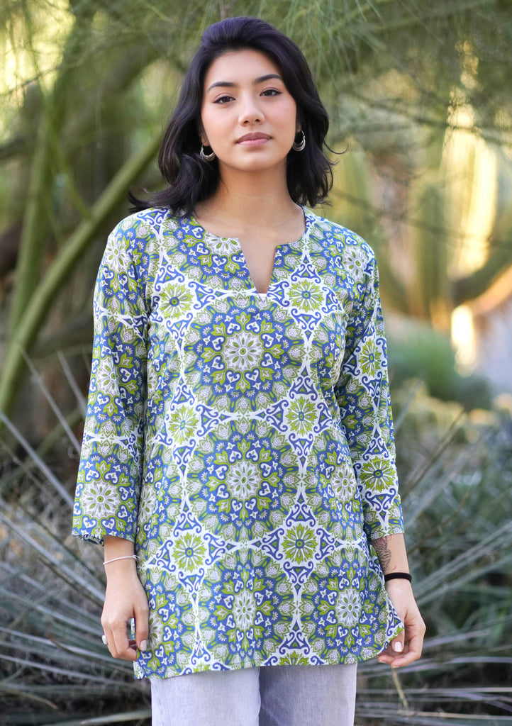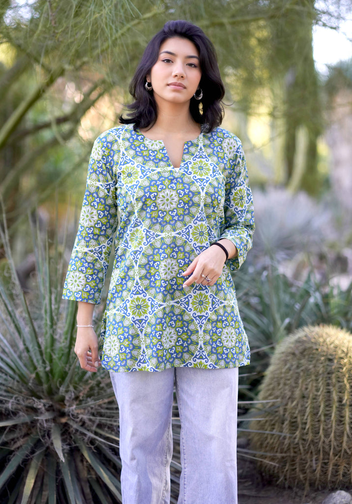 The tunic features 3/4 sleeves, a split v-neck, and side slits at the hemline for easy movement.